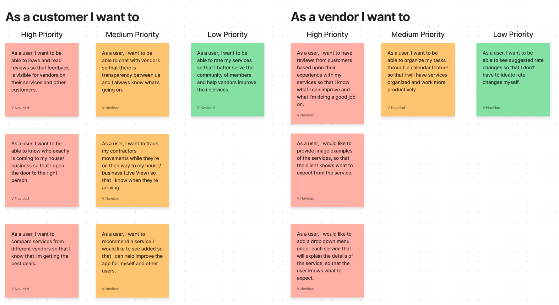 After completing secondary research and competitive analysis to help improve the process of ordering a new task I began ideating user stories from the perspective of the customer and vendor. In order of high medium and low priority we were able to articulate how the addition of new features will provide value to the vendors and customers. We took this opportunity to confirm that we were on the same page as the client and understood the full scope of the project.